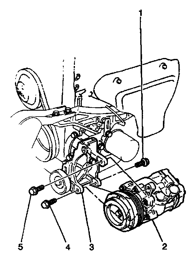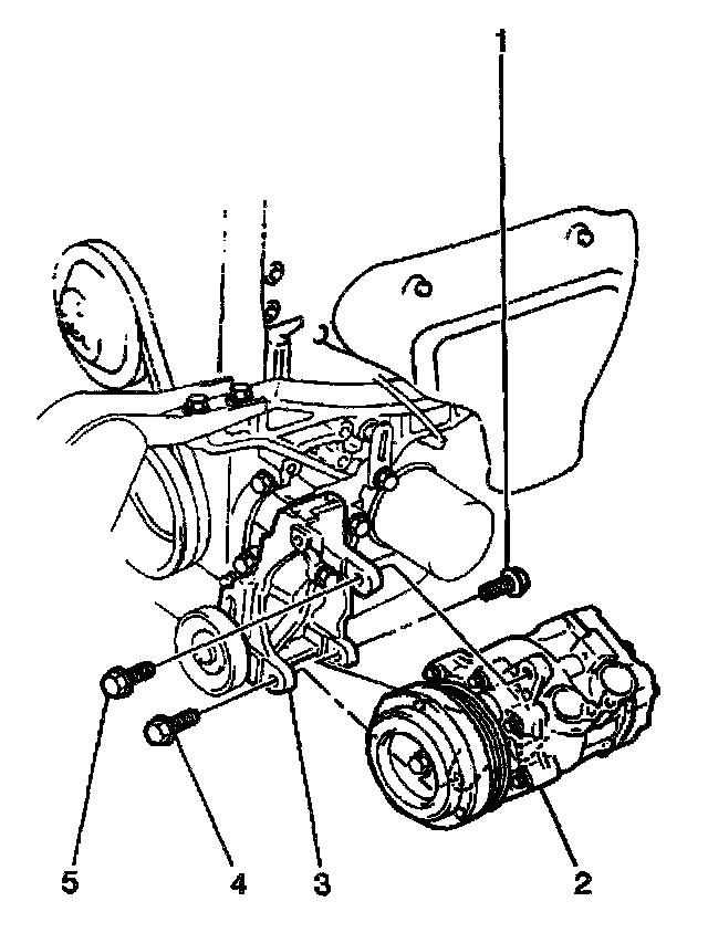 1. Install the compressor to the compressor bracket. Secure the compressor with 3 bolts (1,4,5). Tighten the bolts in the following sequence: