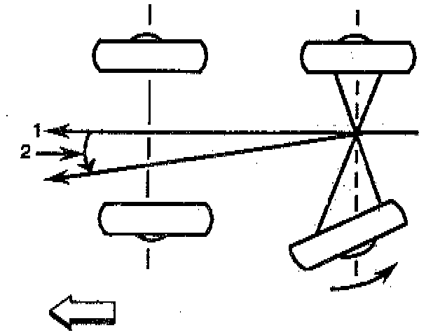The front wheels aim or steer the vehicle, but the rear wheels control tracking. This tracking action is. relative to thrust angle and rear wheel toe. Thrust angle is defined as the path that the rear wheels will take. Ideally, the thrust angle is geometrically aligned with the body centerline.