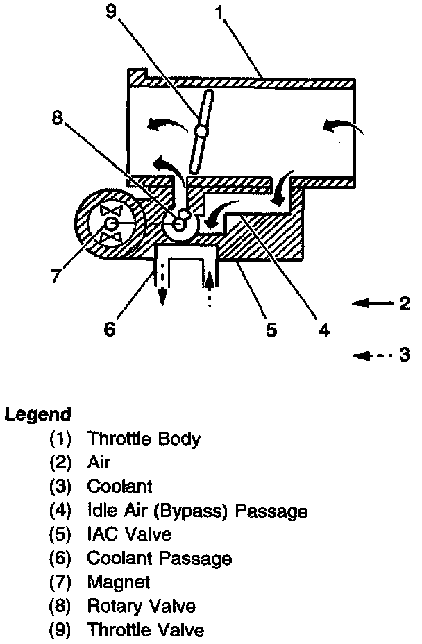 The IAC valve contains an engine coolant passage that enables the IAC valve to operate more efficiently at cold temperatures. The IAC valve enables the PCM to easily control engine idle speed by precisely metering the engine's air intake at closed throttle.