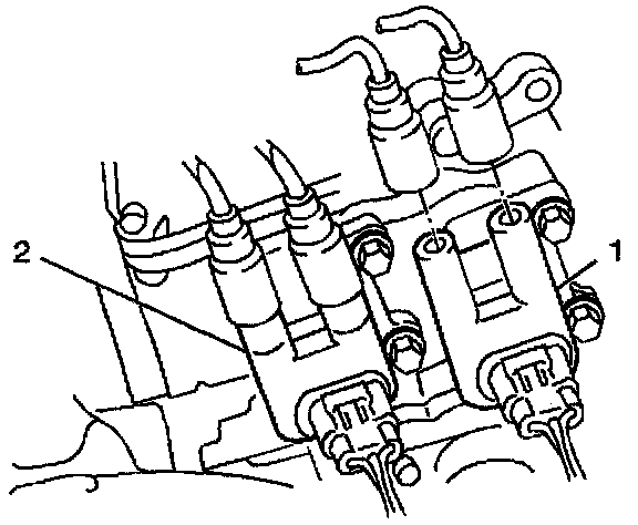 Removal Procedure1. Disconnect the two spark plug wires from the 1 - 4 ignition coil (2) or the 2 - 3 ignition coil (1).