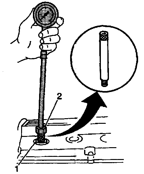 5. Install a compression gage (2) into a spark plug hole.