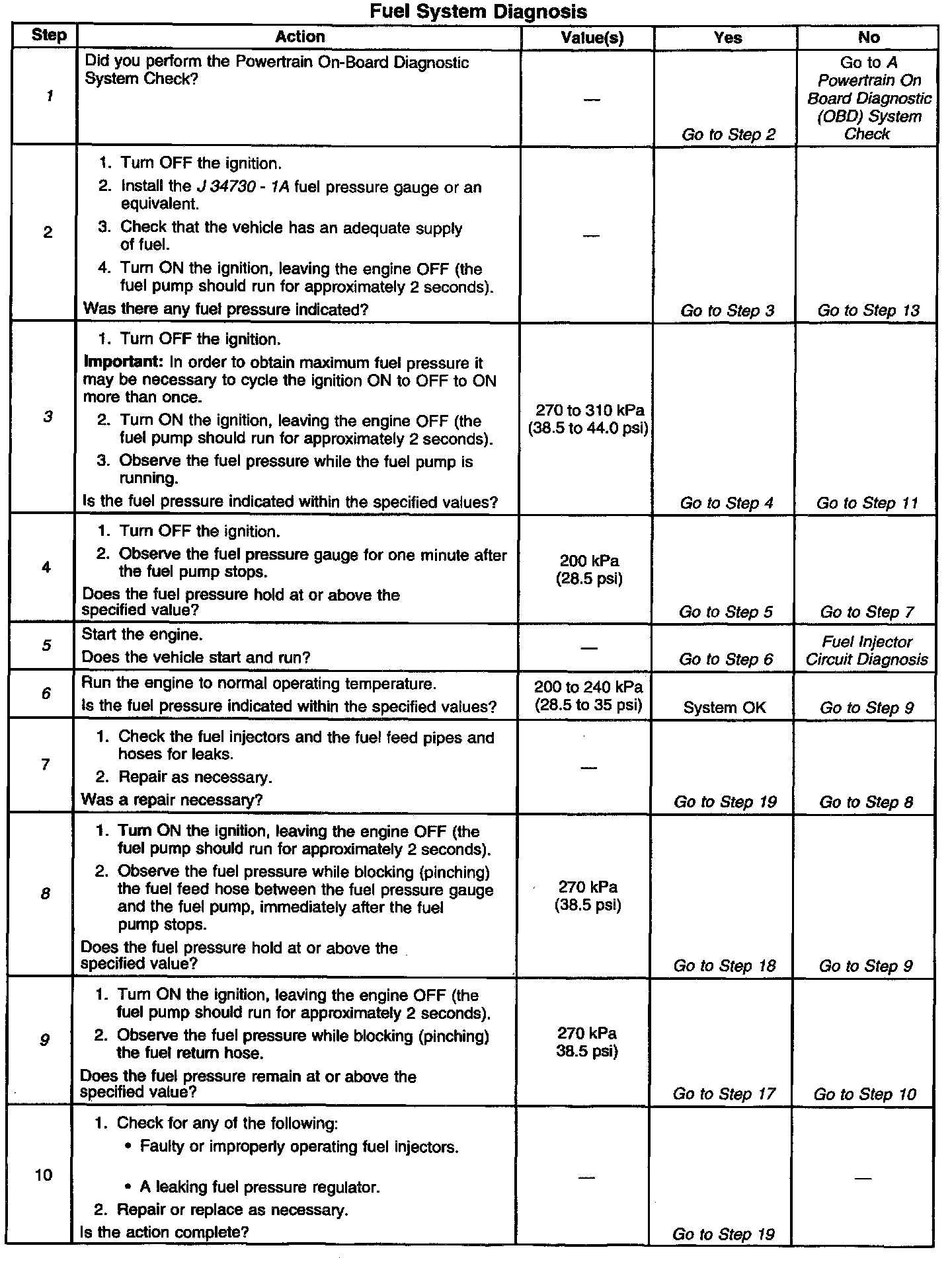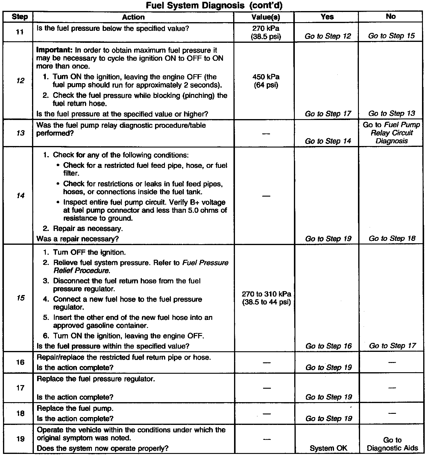 14. This step checks for additional conditions that can cause low fuel pressure other than a faulty fuel pump. Check for any restrictions or blockage in the fuel feed lines and hoses, including those inside the fuel tank. Check the fuel pump electrical circuit for excessive resistance. Proper fuel pump operation requires correct voltage and adequate current flow.