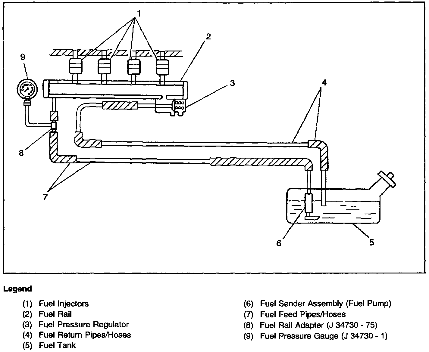 The fuel pump will deliver fuel to the fuel injectors in the fuel rail at a controlled pressure. The controlled pressure is 270-310 kPa (38.5-44 psi) when the fuel pump is energized and the engine not running. The controlled pressure is 200-240 kPa (28.5-34 psi) when the engine is idling at normal operating temperatures. The fuel pressure regulator maintains the correct fuel pressure at all times by returning excess fuel to the fuel tank.