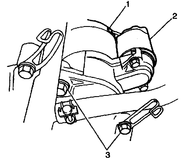 1. Install the starter motor assembly (1) to the vehicle. Secure the assembly with two mounting bolts (3).