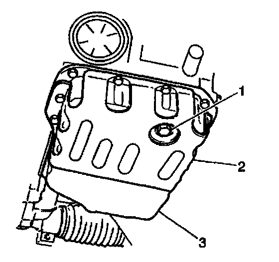 3. Remove the transaxle drain plug (1) from the transaxle fluid pan (3) and drain the fluid into the drain pan or suitable container.