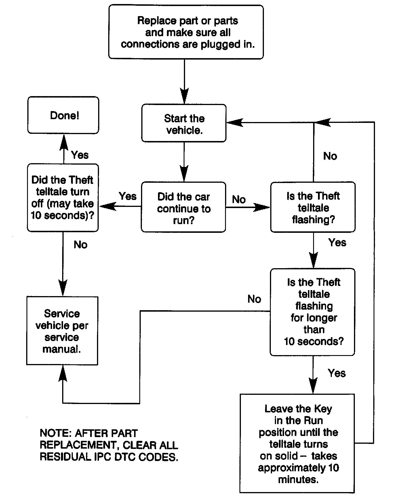 If any of these parts are replaced, the vehicle may start and stall for 10 (ten) minutes (LONG TAMPER MODE). If this occurs, the system MUST go through a Long Tamper Mode cycle. During this time, the THEFT Indicator will be flashing for the full ten minutes. The Instrument Cluster and Powertrain Control Module (PCM) require the full ten minutes to complete a learn cycle. The Ignition Switch MUST remain in the RUN position until the indicator stops flashing or the cycle will have to be repeated.