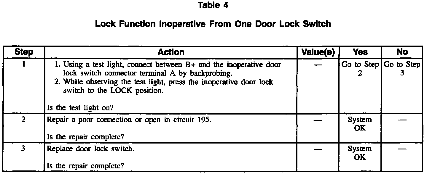 Table 4 Lock Function Inoperative From One Door Lock Switch: