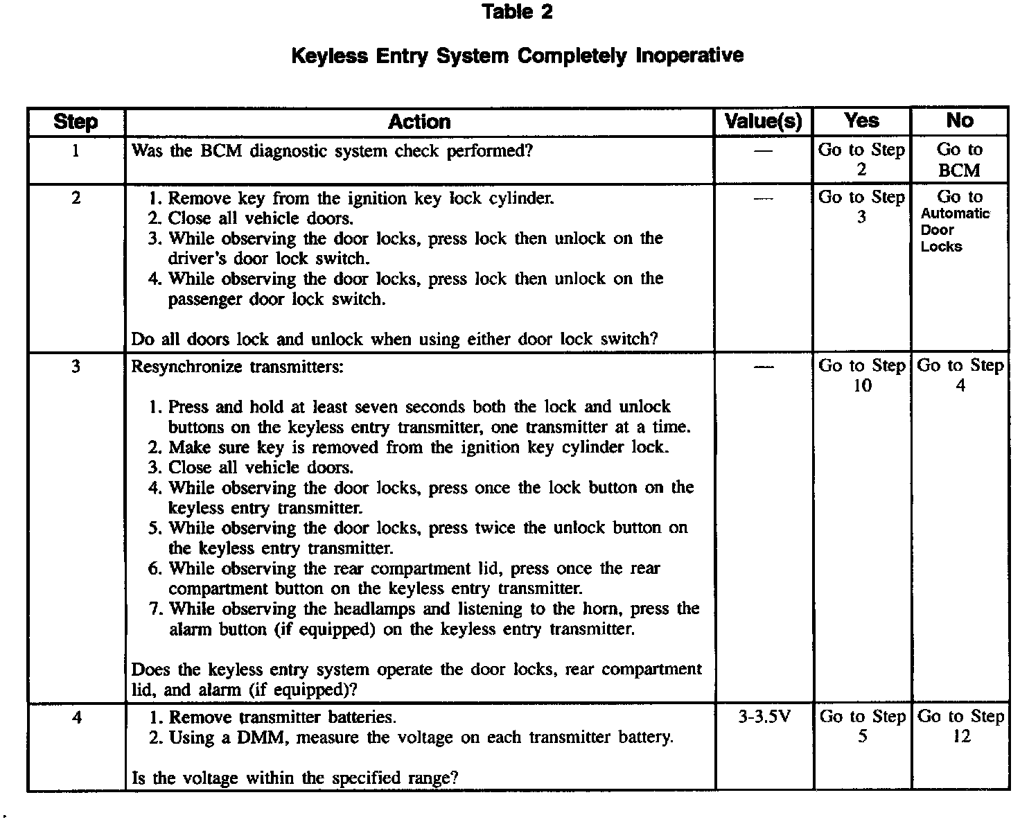 Table 2 Keyless Entry System Completely Inoperative (Part 3 Of 3):