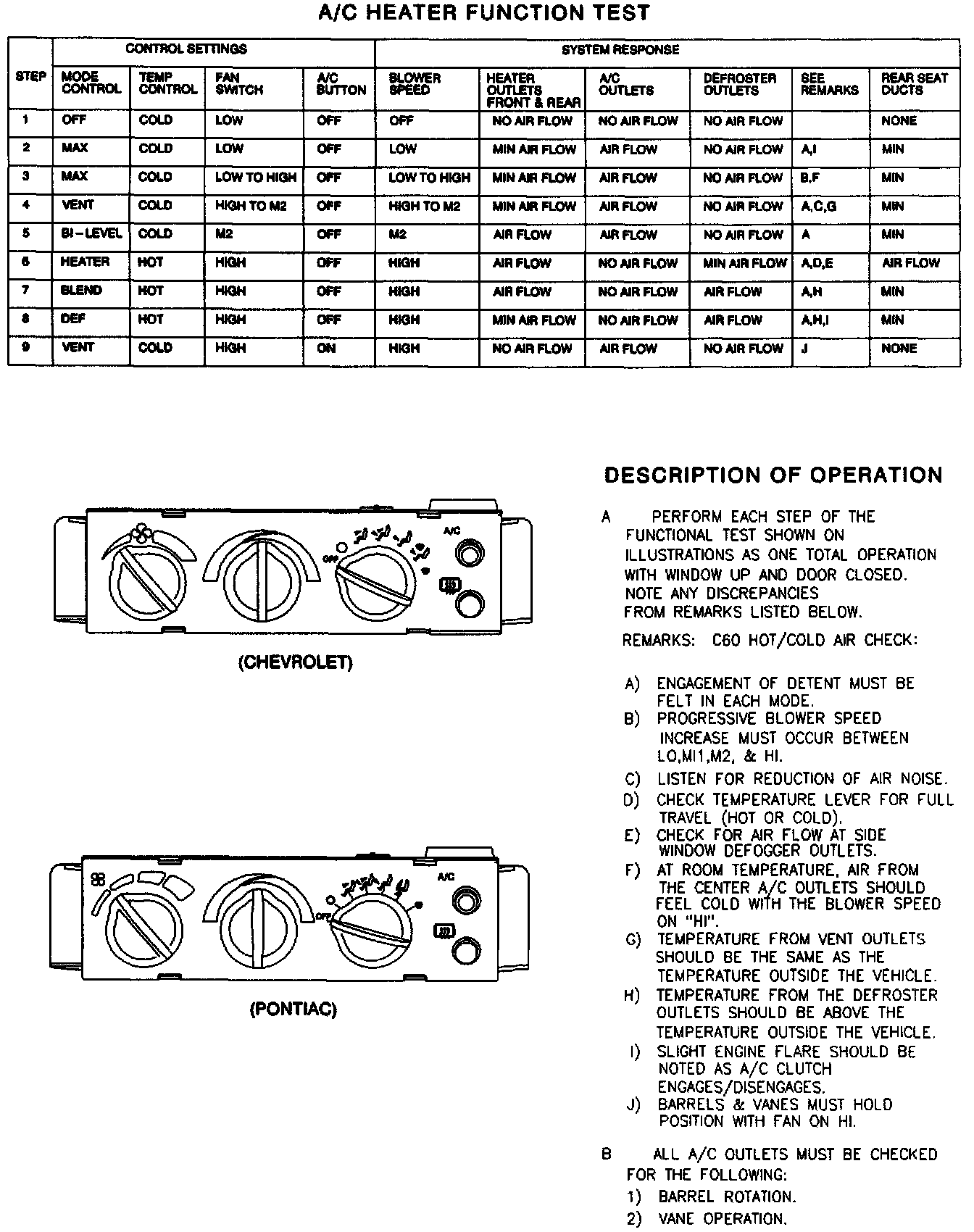 3. Operation of the Heater and A/C mode lever to distribute air from the appropriate outlets indicate proper operation. The system will default to air flow in several modes if a vacuum system malfunction exists.