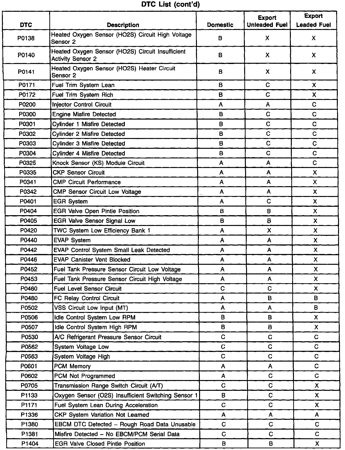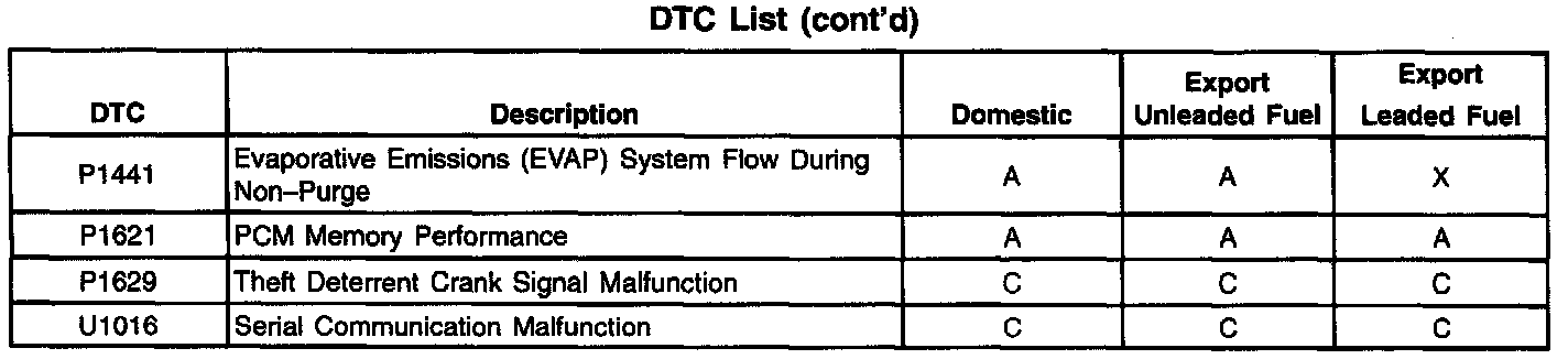 The service information contained in this manual refers to the Federal calibration package. The export change is NOT reflected in the service information on the DTC's diagnostic support information page or in the Repair Instructions. Export vehicles may have differences in DTC types that will affect Malfunction Indicator Lamp (MIL) operation. Certain DTCs have been changed from type A to type C or, in some cases, type x. When a type A diagnostic fails, a DTC is set immediately and the MIL is illuminated. When a type B DTC diagnostic fails, the MIL will illuminate if the fault is present after two consecutive drive trips. A type C DTC will set after one failure and be stored in history but will not illuminate the MIL. Type X DTCs have been turned oft. The diagnostic does not run, no codes are stored, and the MIL will not illuminate.