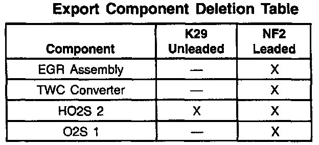 If a system is malfunctioning and the associated DTC has been disabled (Type X), it may be beneficial to use the diagnostic table as a guide to aid in diagnosis. Many of the DTC tables include a functional check of the system that may pinpoint a problem. However, it is important to remember that the DTC tables are specifically designed for use only when a DTC is set. Therefore, a thorough understanding of the normal operation of the system being diagnosed is necessary and use of the tables for this purpose is at the discretion of the technician. An export vehicle may have unrequired emissions components removed. If a component is removed, the deletion table below will mark that components box with an X.