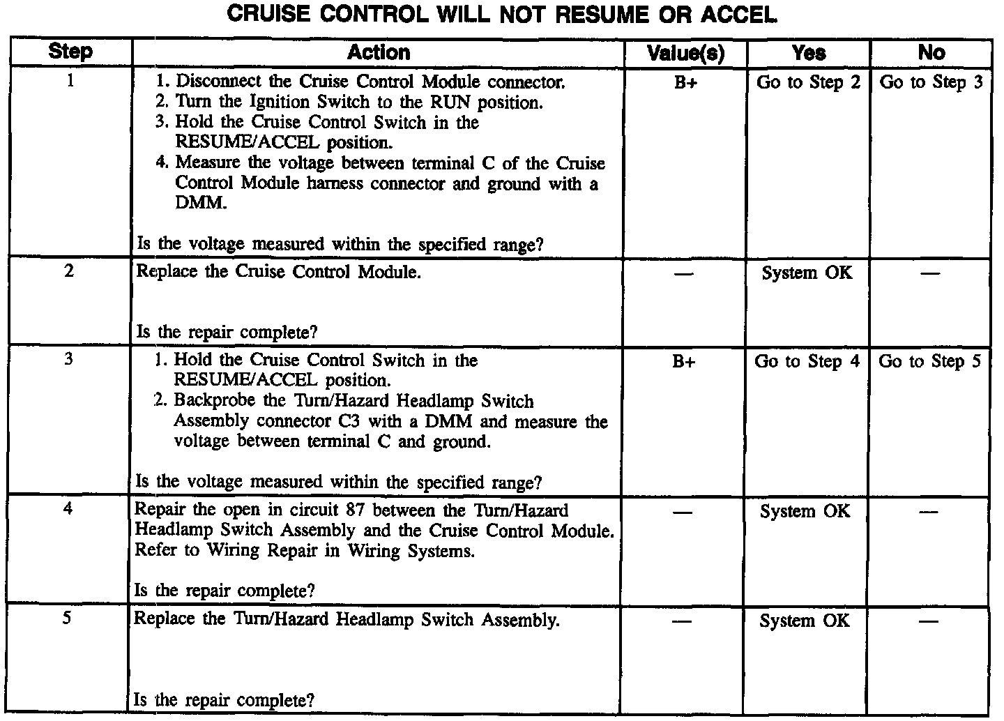 Cruise Control Will Not Resume or Accel
