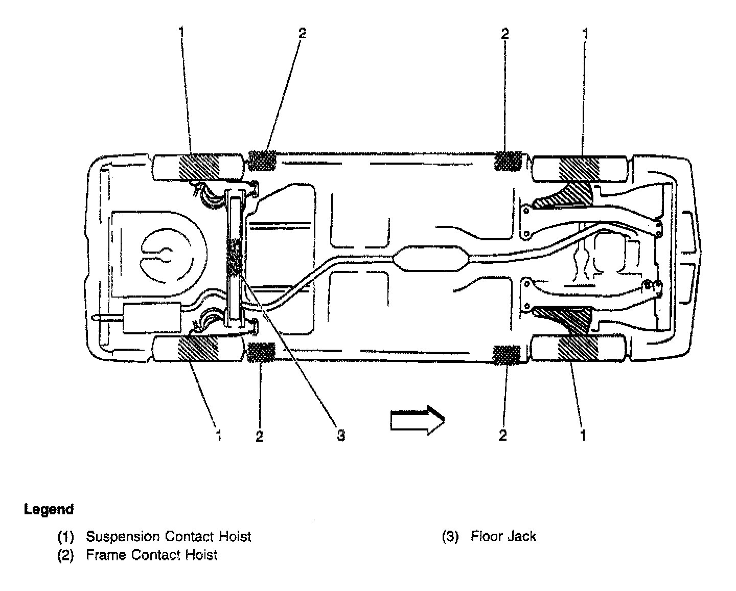 Caution: To help avoid personal injury, when a vehicle is on a hoist, provide additional support for the vehicle at the opposite end from which you are removing components. The additional support will reduce the possibility of the vehicle falling off the hoist. When you are removing major components from the vehicle while the vehicle is on a hoist, chain the vehicle frame to the hoist pads at the same end from which you are removing the major components to prevent tip-off. If you fail to follow these precautionary measures, vehicle damage, serious personal injury, or death may result.