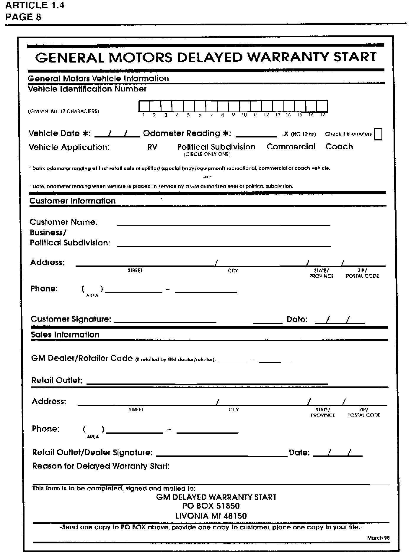 EFFECTIVE JANUARY 1, 1999, the "Notice of Delayed Warranty Start" process must follow the guidelines contained in the 1999 GM Service Policies and Procedures Manual, Article 1.4.13. The form titled "General Motors Delayed Warranty Start" may be reproduced locally. It is very important that the signed, completed form is mailed to the address printed on the bottom of the form.