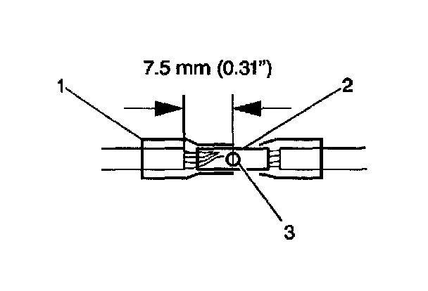 6. Place the splice sleeve in the nest. Ensure that the crimp falls midway between the end of the barrel and the stop. The sleeve has a stop (3) in the middle of the barrel (2) in order to prevent the wire (1) from going further. Close the hand crimper handles slightly in order to firmly hold the splice sleeve in the proper nest.