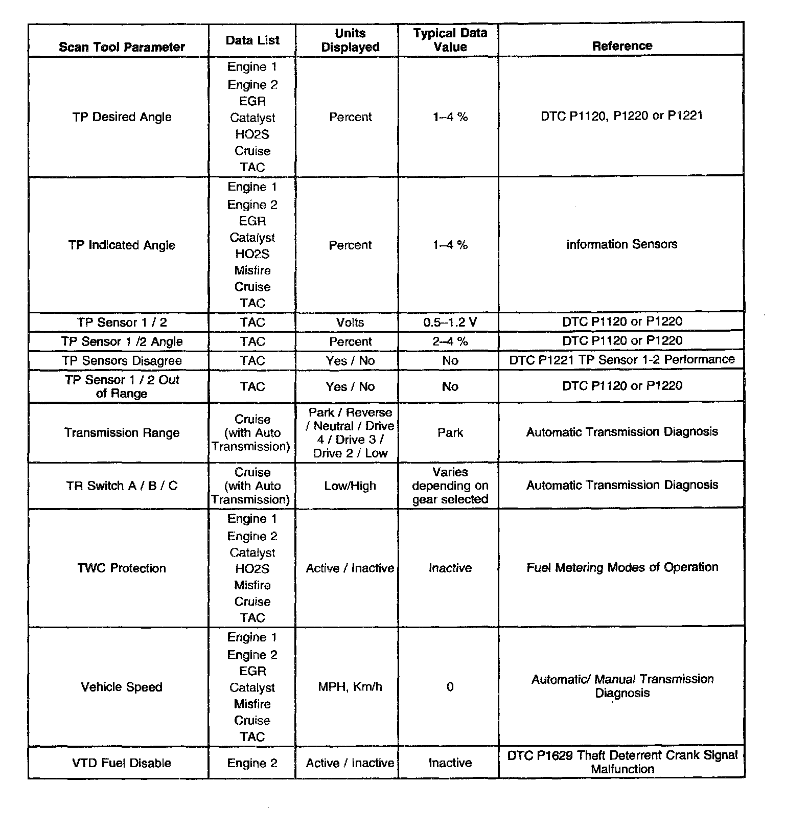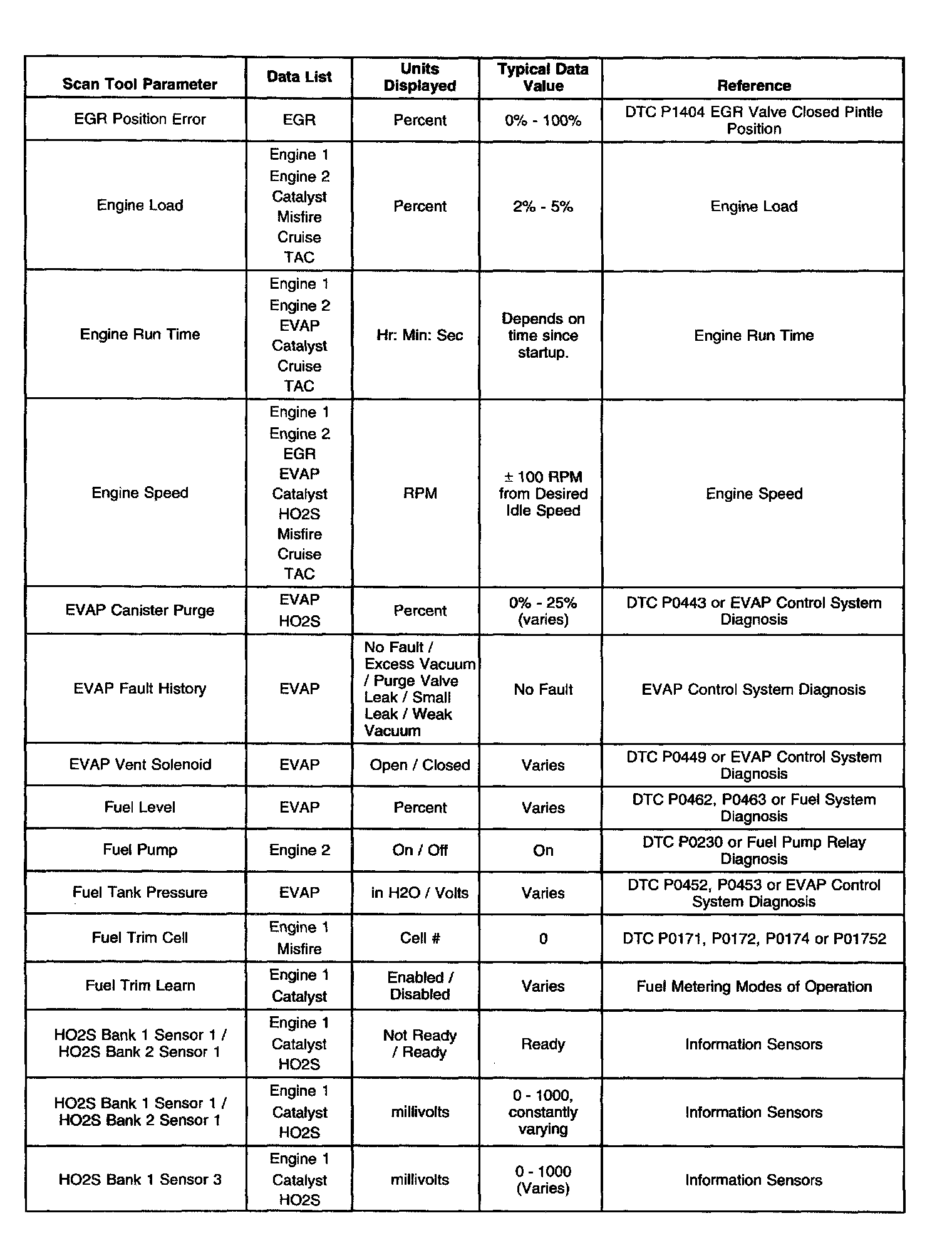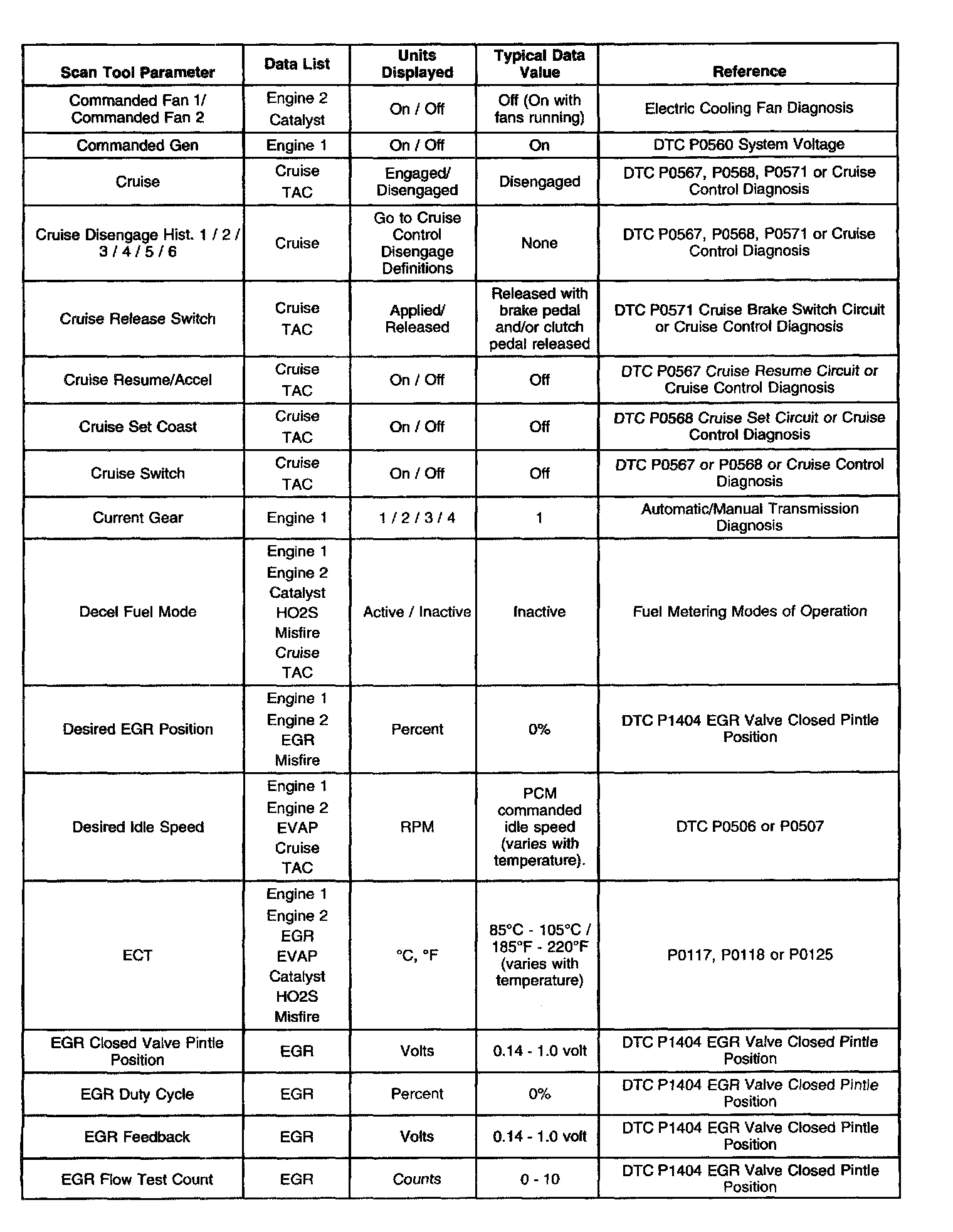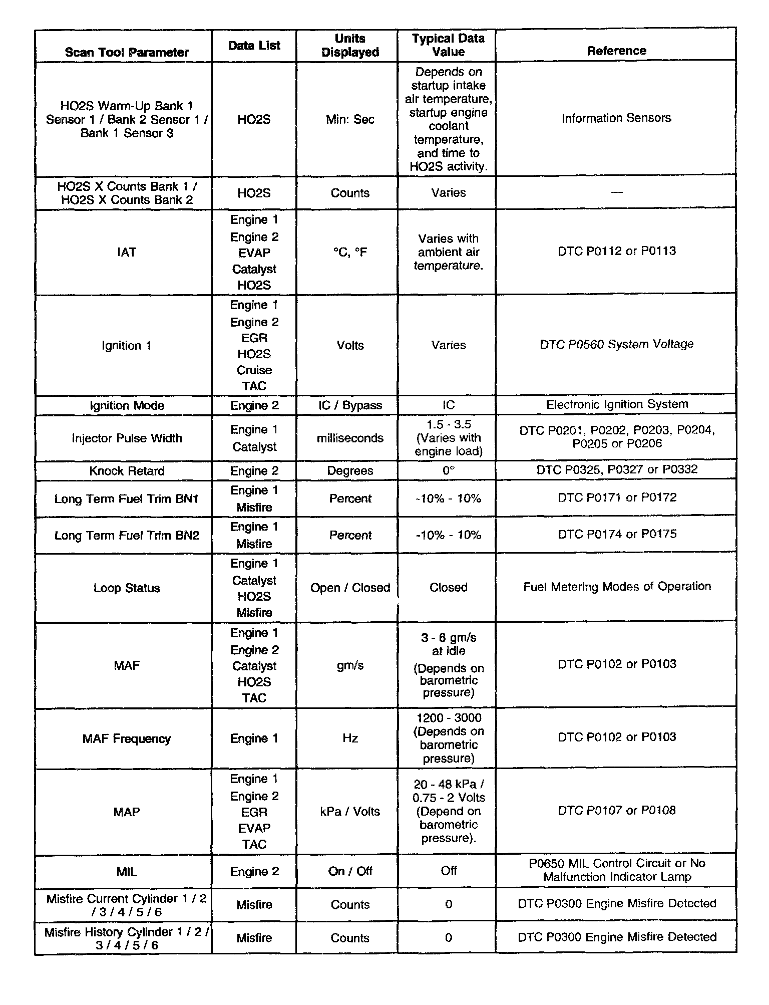 Use the Typical Scan Data Values table only after the Powertrain On-Board Diagnostic System Check has been completed, no DTCs were noted and you have determined the on-board diagnostics are functioning properly. Scan tool values from a properly running engine may be used for comparison with the engine you are diagnosing. The Typical Scan Data values represent values that would be seen on a normally running engine.