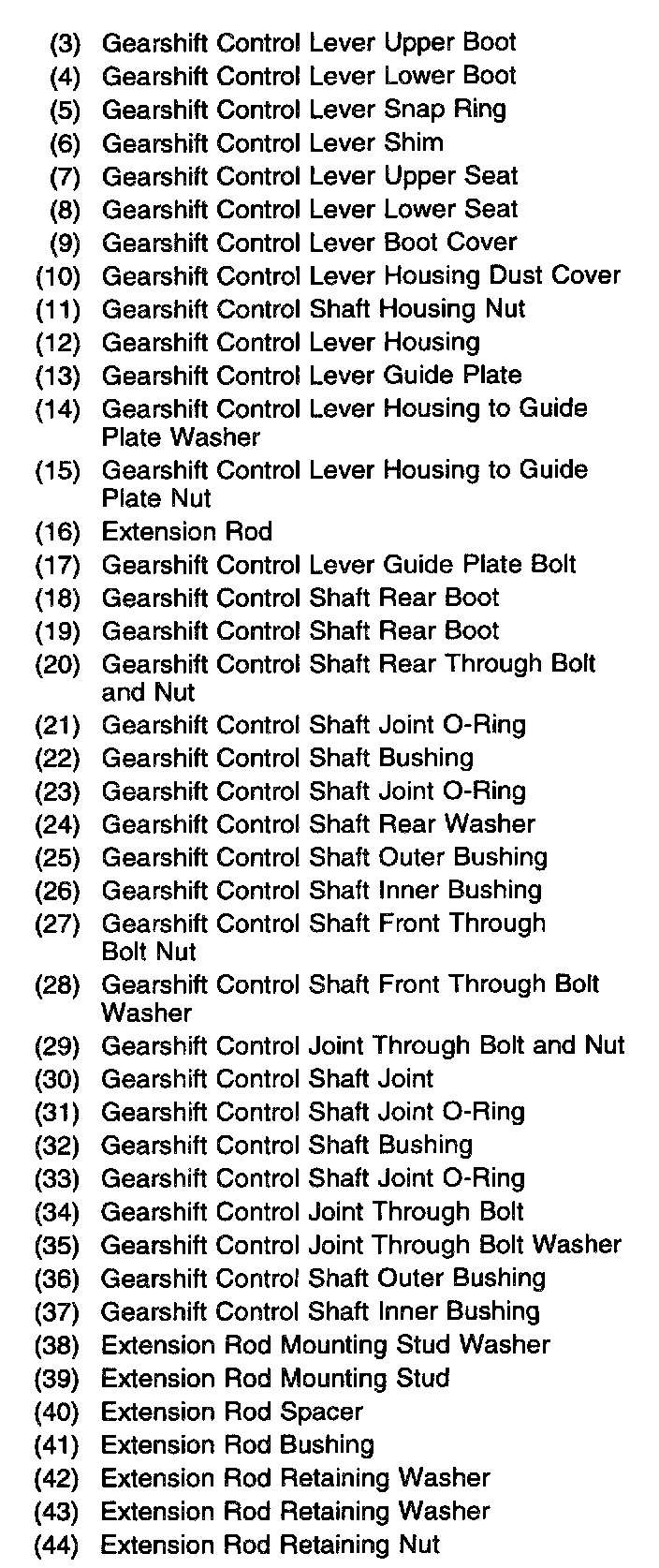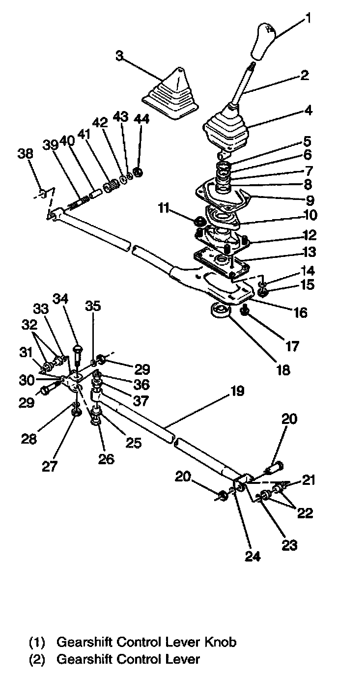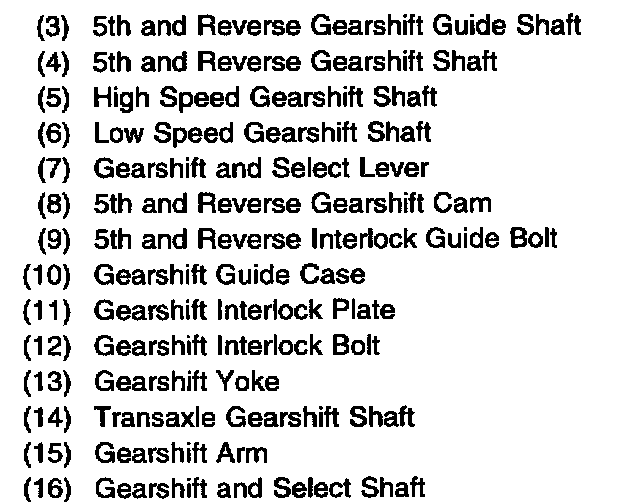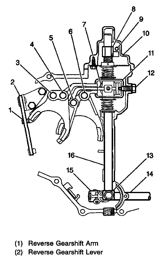 Gear selection begins in the gearshift control lever (1). The gearshift control shaft transmits gear selection from the gearshift control lever to the transaxle. The gearshift control shaft joint connects the gearshift control shaft to the transaxle gearshift shaft.