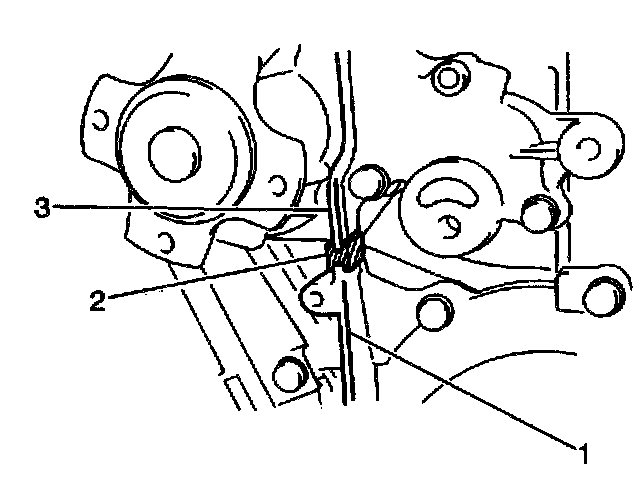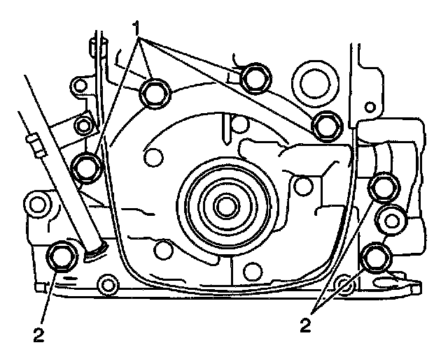 7. Apply GM P/N 12346004 or the equivalent to the thread portion of the short oil pump mounting bolt (1) indicated.