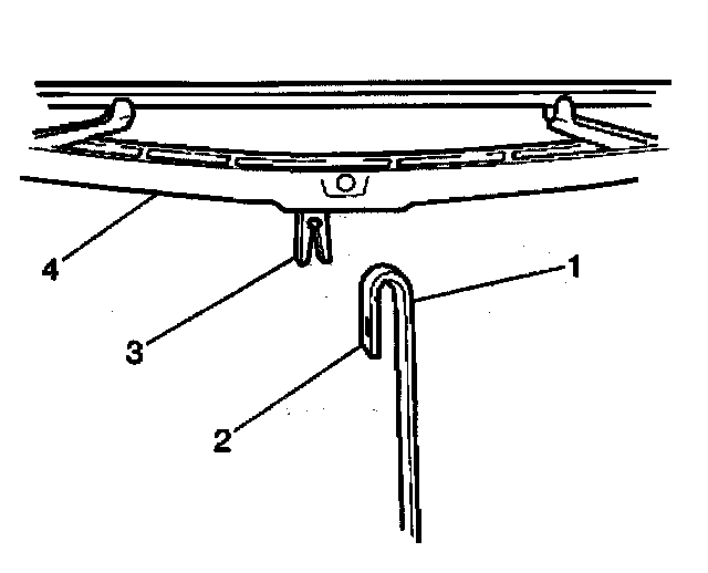 1. Depress the retaining tab (3) on the rear wiper blade assembly (4).