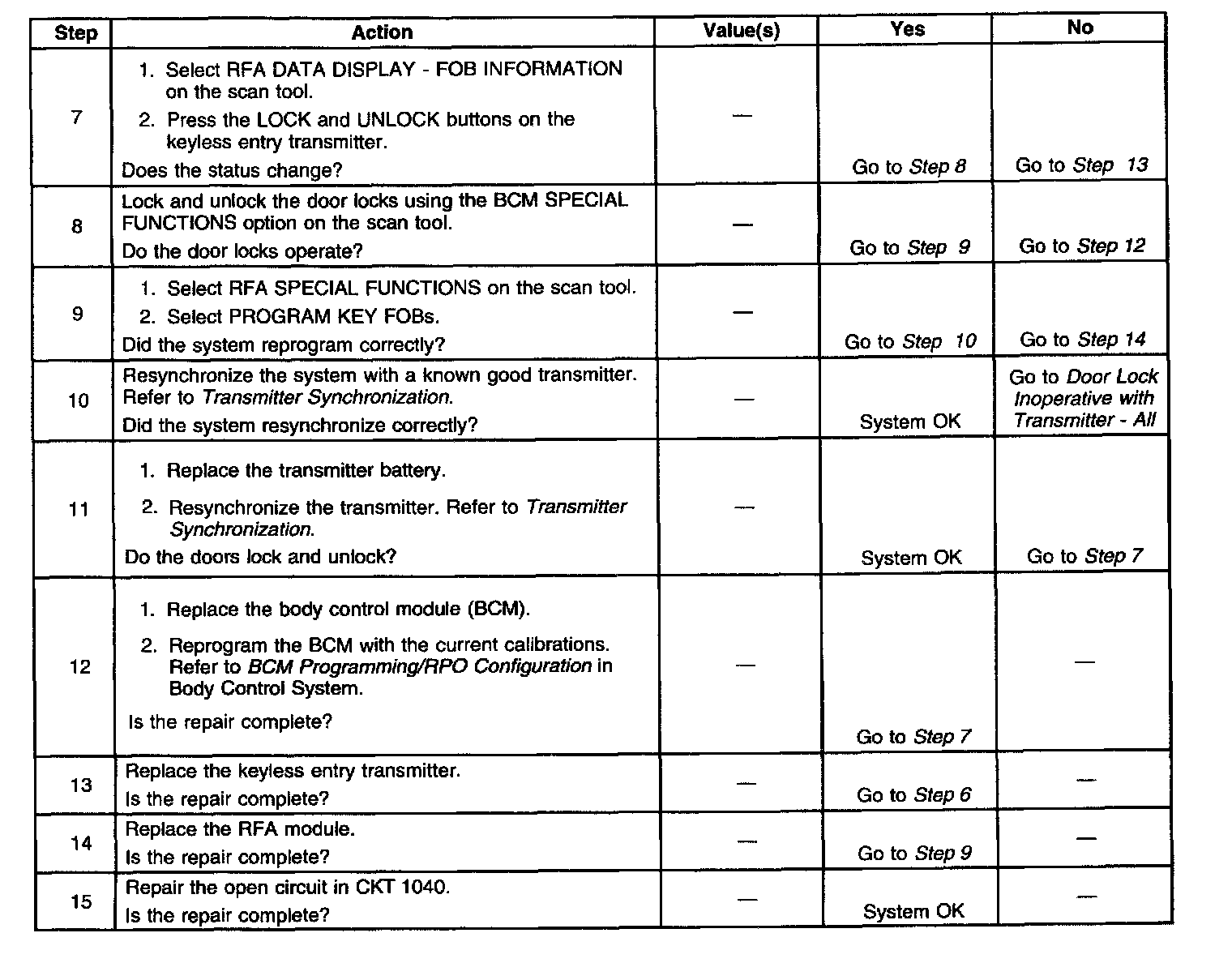 ^ Try a second transmitter, if available. If the second transmitter operates the system correctly, remove the battery and install the battery in the first transmitter. Perform the synchronizing transmitter procedure. Try the first transmitter again. If the first transmitter operates the system correctly, replace the battery. If the first transmitter still does not operate correctly, replace the transmitter.