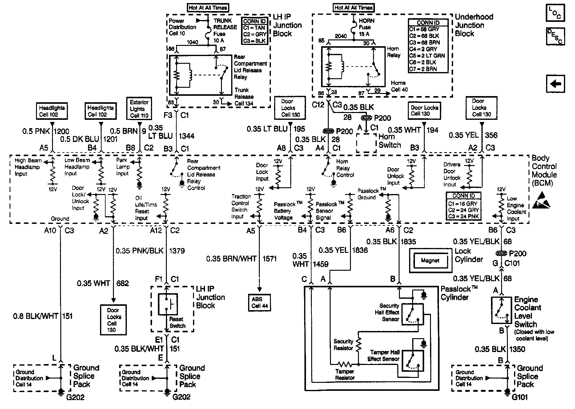 Body Control Module Schematics: Engine Coolant Level Switch, Horn Switch, And Passlock Cylinder: