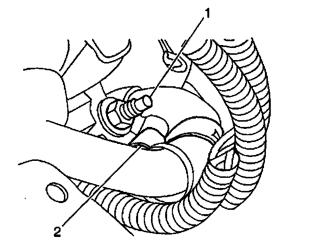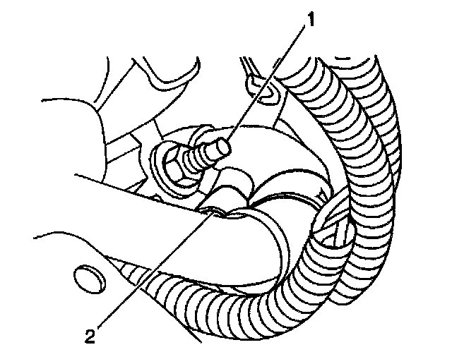 2. Remove the power steering hose retainer nut (1) from the retainer (2).