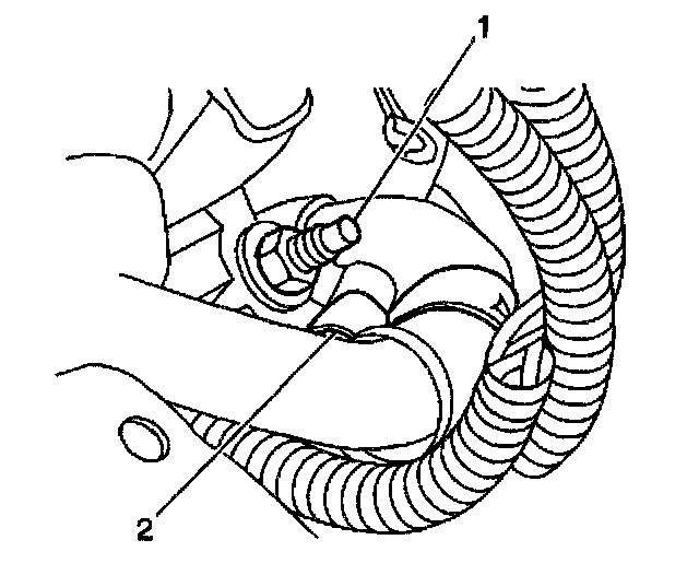 2. Remove the power steering hose nut (1) and retainer (2).