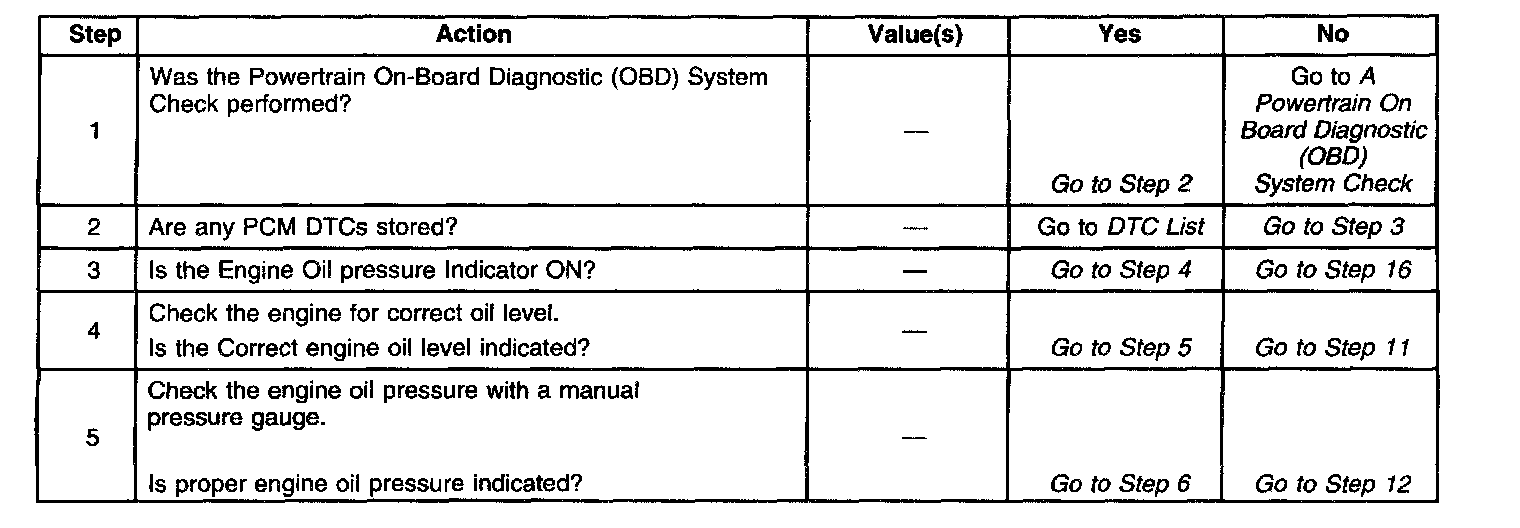 The PCM applies battery voltage through a pull up resistor to the Engine Oil Pressure Switch circuit. The PCM monitors the applied voltage on the Engine Oil Pressure Switch circuit. If the ignition switch is turned ON with the engine not running or engine oil pressure is below 35 kPa (5 psi), the Engine Oil Pressure switch grounds the PCM voltage input. The PCM sends the engine oil pressure information via Class II serial data to the Instrument Panel Cluster (IPC). The IPC controls the Engine Oil Pressure Indicator.
