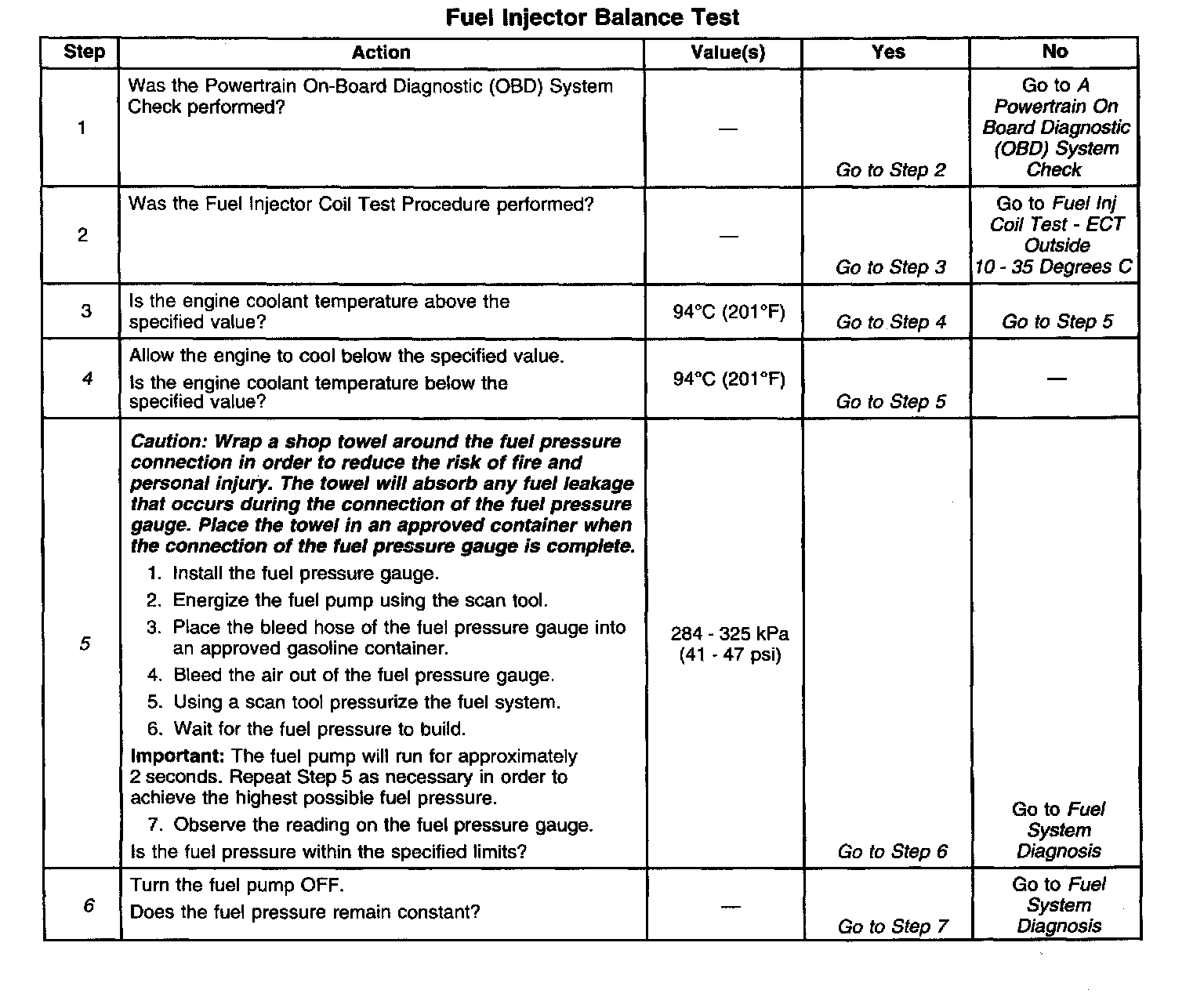 6. The fuel pressure should reach a steady value. If the fuel pressure does not reach a steady value, go to Fuel System Pressure Test. Fuel System Pressure Test