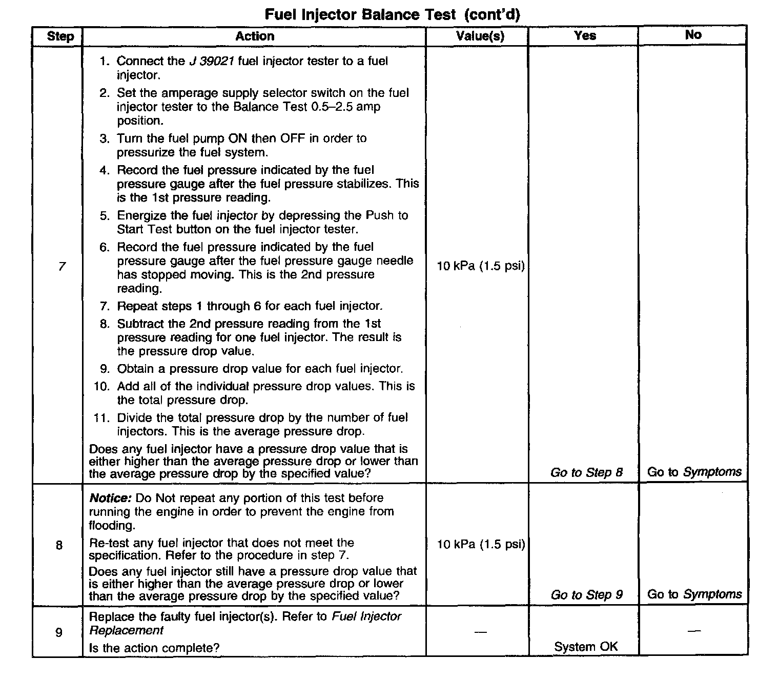 7. If the pressure drop value for each fuel injector is within 10 kPa (1.5 psi) of the average pressure drop value, the fuel injectors are flowing properly. Calculate the pressure drop value for each fuel injector by subtracting the second pressure reading from the first pressure reading.