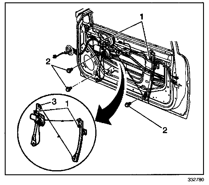 1. Install the rear run channel (1). Secure with the channel bolt (2).