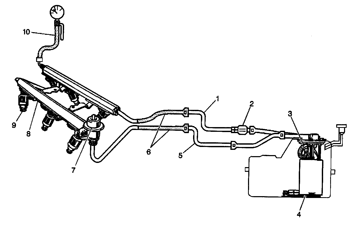 When the ignition switch is turned ON, the Powertrain Control Module (PCM) will turn ON the in-tank fuel pump. The in-tank fuel pump will remain ON as long as the engine is cranking or running and the PCM is receiving reference pulses. If there are no reference pulses, the PCM will turn the in-tank fuel pump OFF 2 seconds after the ignition switch is turned ON or 2 seconds after the engine stops running. The in-tank fuel pump is an electric pump within an integral reservoir (4). The in-tank fuel pump supplies fuel through the fuel feed pipe (1), and in-line fuel filter (2) to the Fuel Rail Assembly (8). The fuel pump is designed to provide fuel at a pressure above the pressure needed by the fuel injectors (9). A fuel pressure regulator (7), attached to the Fuel Rail, keeps the fuel available to the fuel injectors at a regulated pressure. Unused fuel is returned to the fuel tank by a separate fuel return pipe (5). The fuel pump flex pipe (3) functions as a conduit for transporting pressurized fuel from the fuel pump to the above cover fuel feed pipe. The fuel pump flex pipe also eliminates fuel pump generated pressure pulse noise, and eliminates clamps formerly needed for rubber hoses or nylon pipes. The fuel pressure gauge J 34730-1A (10). The fuel pipe return and feed hose assemblies are the pinch points used during the fuel system pressure test (6).