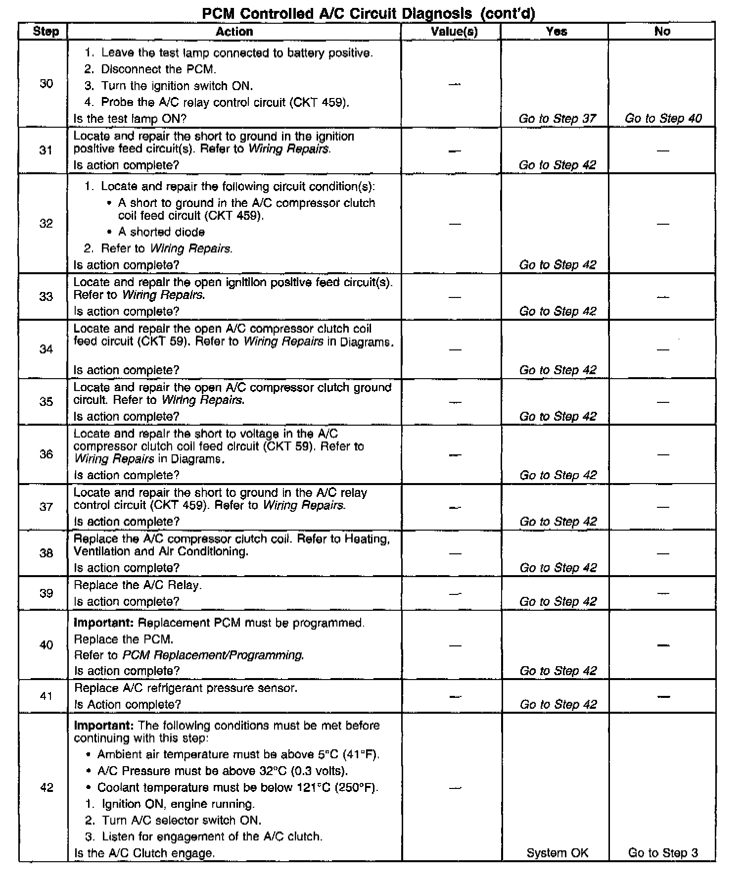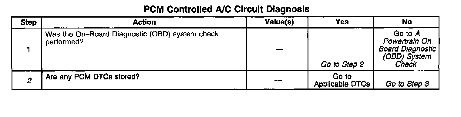 2. Stored Diagnostic Trouble Codes (That may not illuminate the Malfunction indicator Lamp) may disable the A/C compressor. This Diagnostic Table may lead to improper diagnosis and replacement of good parts if Diagnostic Trouble Codes are present.