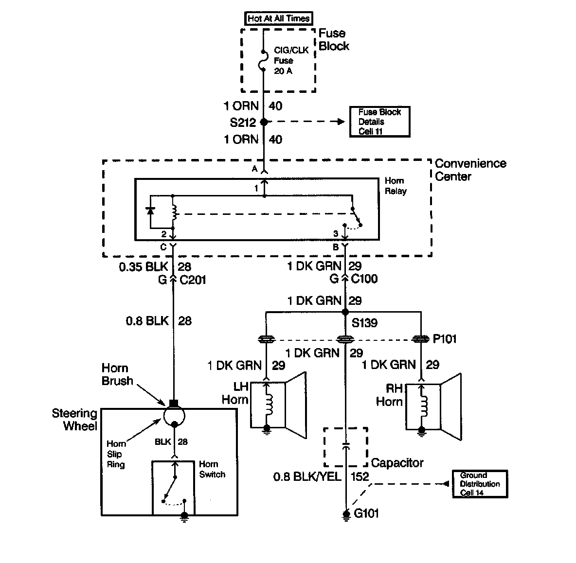 When diagnosing a horn problem use the service information located in the Horns service category. The following schematic is a typical example of a schematic with its supporting text.