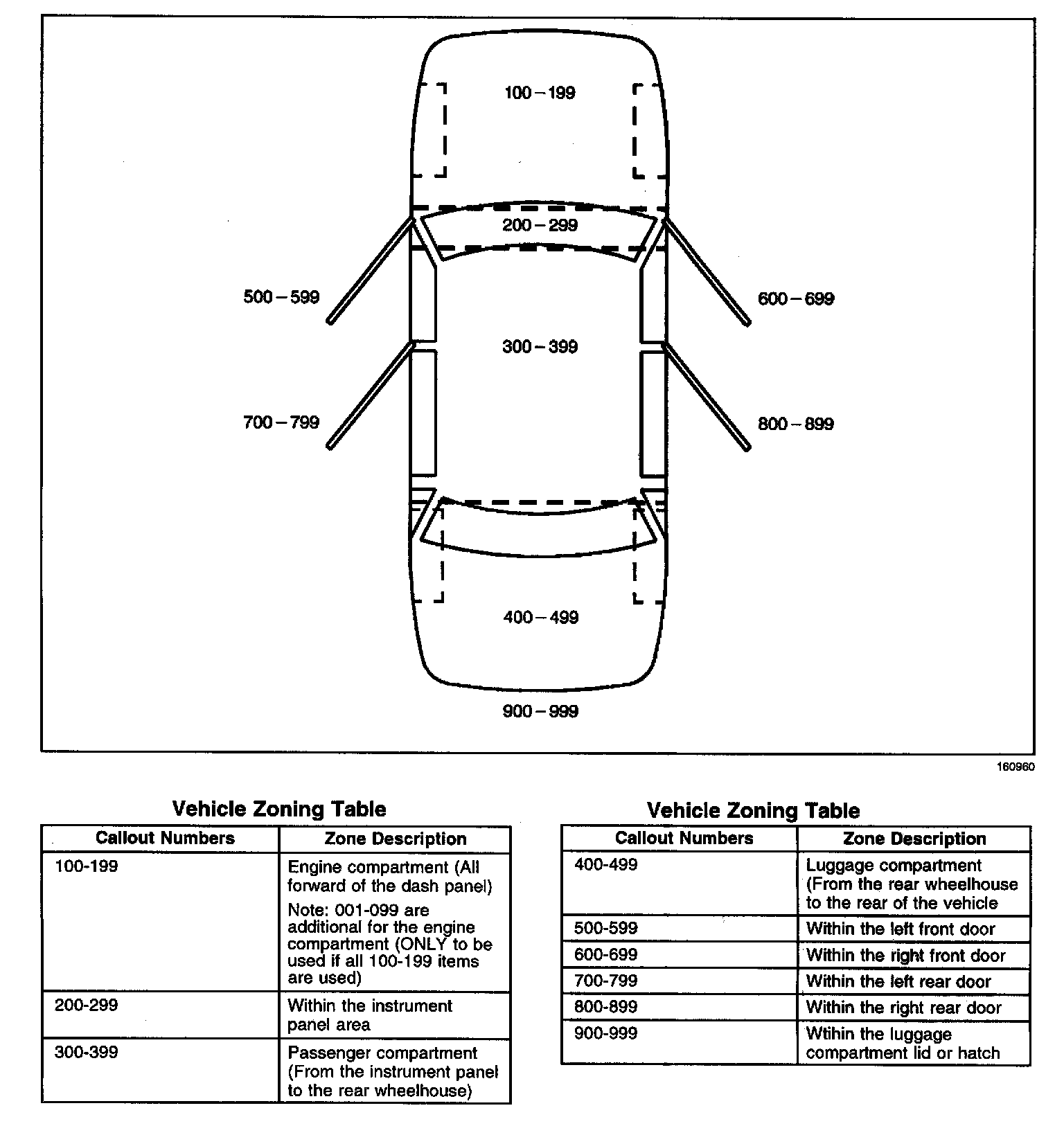 All grounds, in-line connectors, pass-through grommets, and splices have identifying numbers that correspond to where they are located in the vehicle. The following table explains the numbering system.