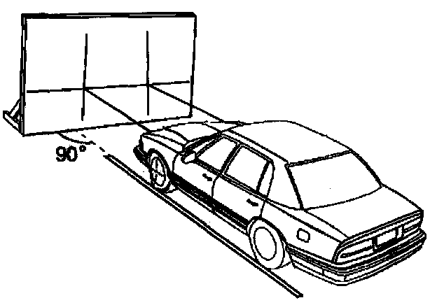 The screen should be a wall or other flat surface at least 1.52 m (5 ft) high by 3.66 m (12 ft) wide with a matte white surface well shaded from extraneous light, and 90 degrees to the floor. The screen should be provided with a permanent vertical reference line 2 feet from the left edge of the screen, 2 laterally adjustable vertical tapes, and one vertically adjustable horizontal tape.