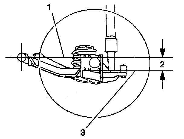 8. Measure the distance between the lowest point on the ball joint housing and the centerline of the control arm bolt. This distance (3) should be 30 - 50 mm (1 3/16 to 2 inch).