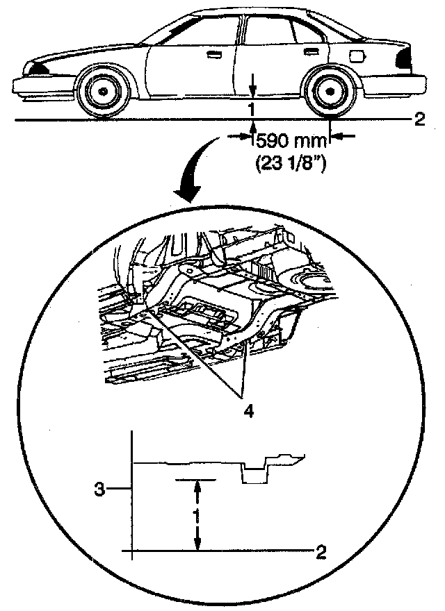 11. Measure the distance (1) from the ground (2) to the rear underbody points (4). This distance (1) 213 - 233 mm (8 3/8 to 9 3/16 inch).