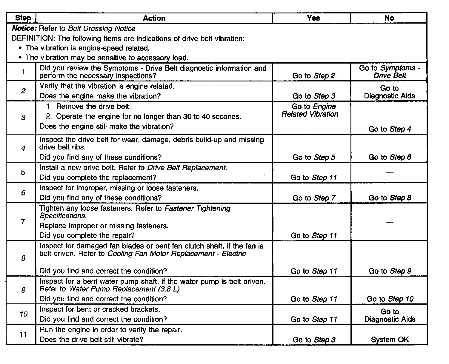 3. This test is to verify that the drive belt or accessory drive components may be causing the vibration. With the drive belt removed the water pump may not operate and the engine may overheat. Also DTCs may set when the engine is operated with the drive belt removed.
