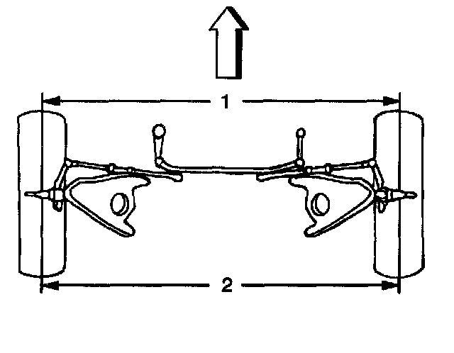 You can also measure total toe, which is the relationship or difference between the front toe dimension (1) and the rear toe dimension (2). Total toe indicates the tire-to-tire relationship, but does not indicate the relationship of a tire to the vehicle centerline. Toe also serves to offset the small deflections of the tire and the wheel support system which occur when the vehicle is rolling forward. In other words, even when the tires and wheels are set to toe in slightly when the vehicle is standing still, the tires tend to roll parallel on the road when the vehicle is moving. Toe affects tire wear.