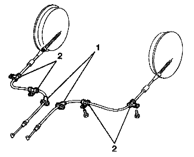 The park brake cables are secured by guides (1,2). The park brake cables pull on the park brake shoe levers in both brake drums. The swivel of the brake shoe lever pushes the rear (trailing) brake shoe against the drum. The friction between the shoe and the drum prevents the tire and wheel assembly from turning.