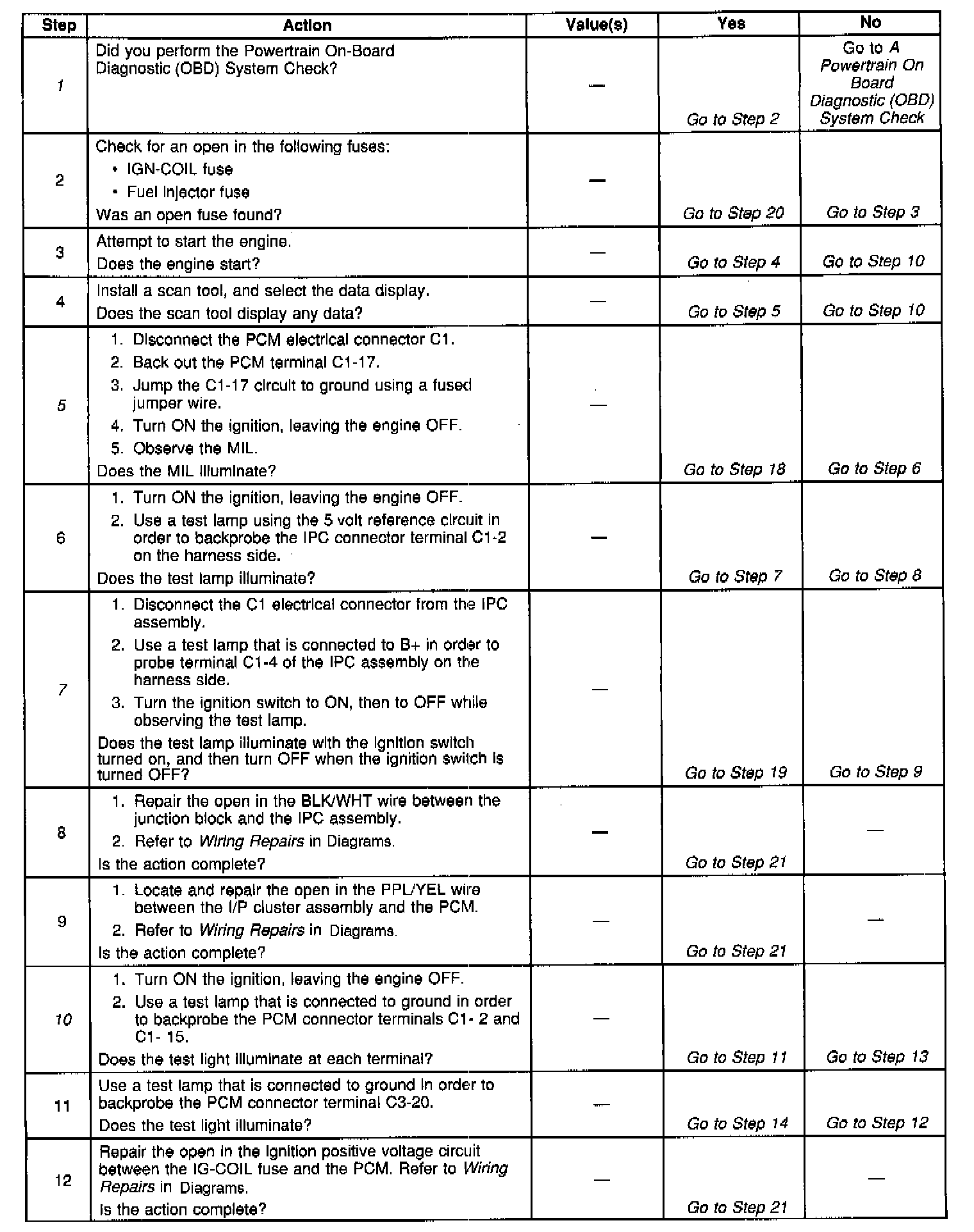 10. This step checks for an open in the Ignition Positive Voltage circuits from the main relay. The engine may start and run but there will not be MIL control or serial data if the circuit is open between the last 2 circuit splices before the PCM.