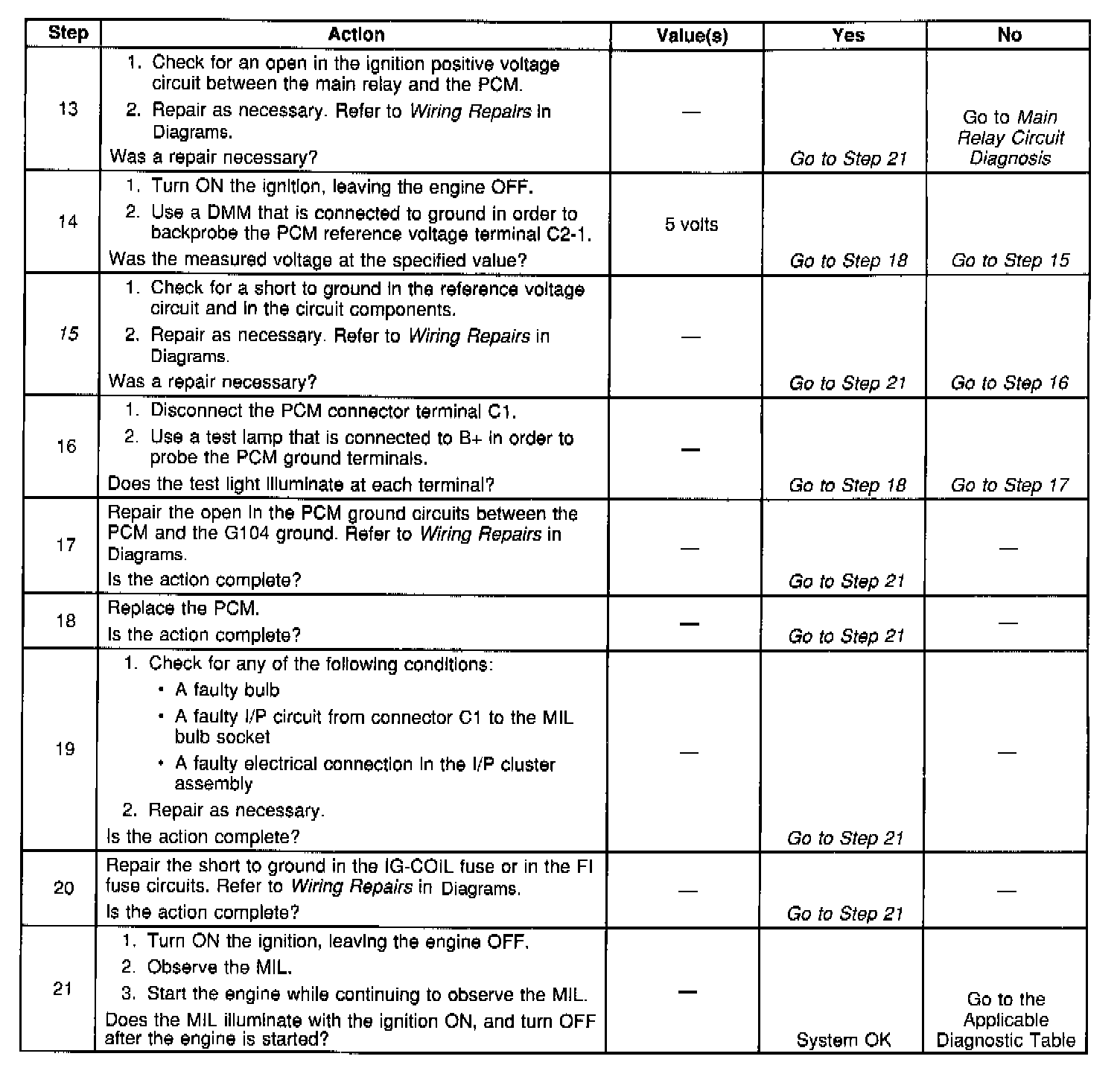 15. This step checks for a short to ground in the PCM 5 volt reference circuit. The MIL will be inoperative and the engine will not start or run if the reference voltage circuit is shorted to ground. Use the 5 volt reference circuit in order to check the circuit wiring, the sensors, and the components for shorts to ground.