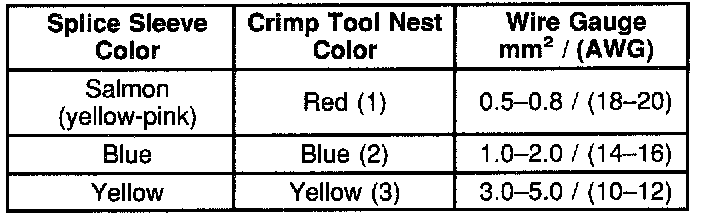 Refer to the table for color coding of the splice sleeves, and the crimp tool nests.