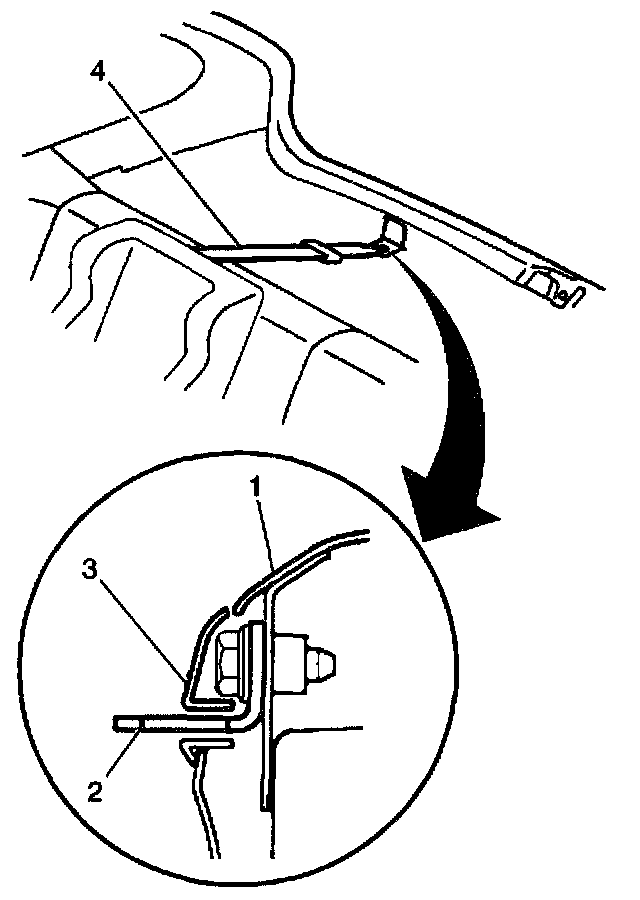 2. Install the rear seat child restraint anchor bracket (2) to the rear end of the vehicle. Secure the bracket with the anchor bolt.