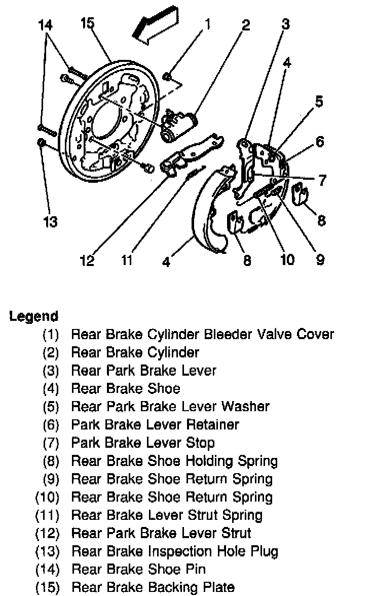 The rear drum brake assembly is a leading/trailing design. When the brakes are applied, the wheel cylinder pistons move both shoes out to contact the drum with enough energy to overcome the rotation of the wheels, slowing and, with continued application, stopping the vehicle.