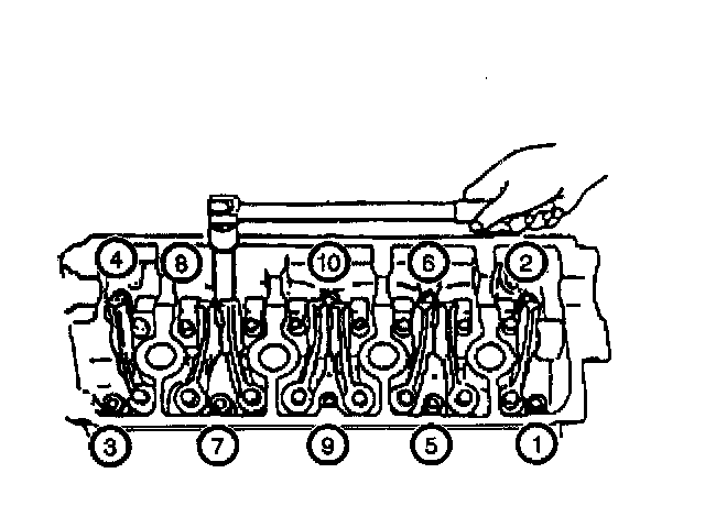 Install the ten bolts in the order specified in the graphic. Tighten the bolts evenly and in small increments of torque. Repeat the tightening sequence three or four times in order to reach the specified torque.