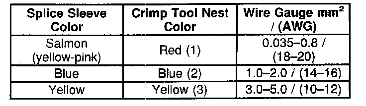4. Select the proper sealed splice sleeve according to the wire size. Refer to the above table at the beginning of the repair procedure for the color coding of the splice sleeves and the crimp tool nests.