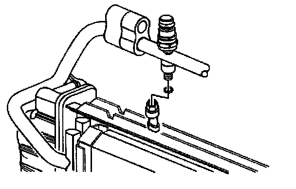 The A/C pressure sensor is located on the condenser end of the compressor hose. A Schrader valve is located in the A/C pressure sensor fitting.