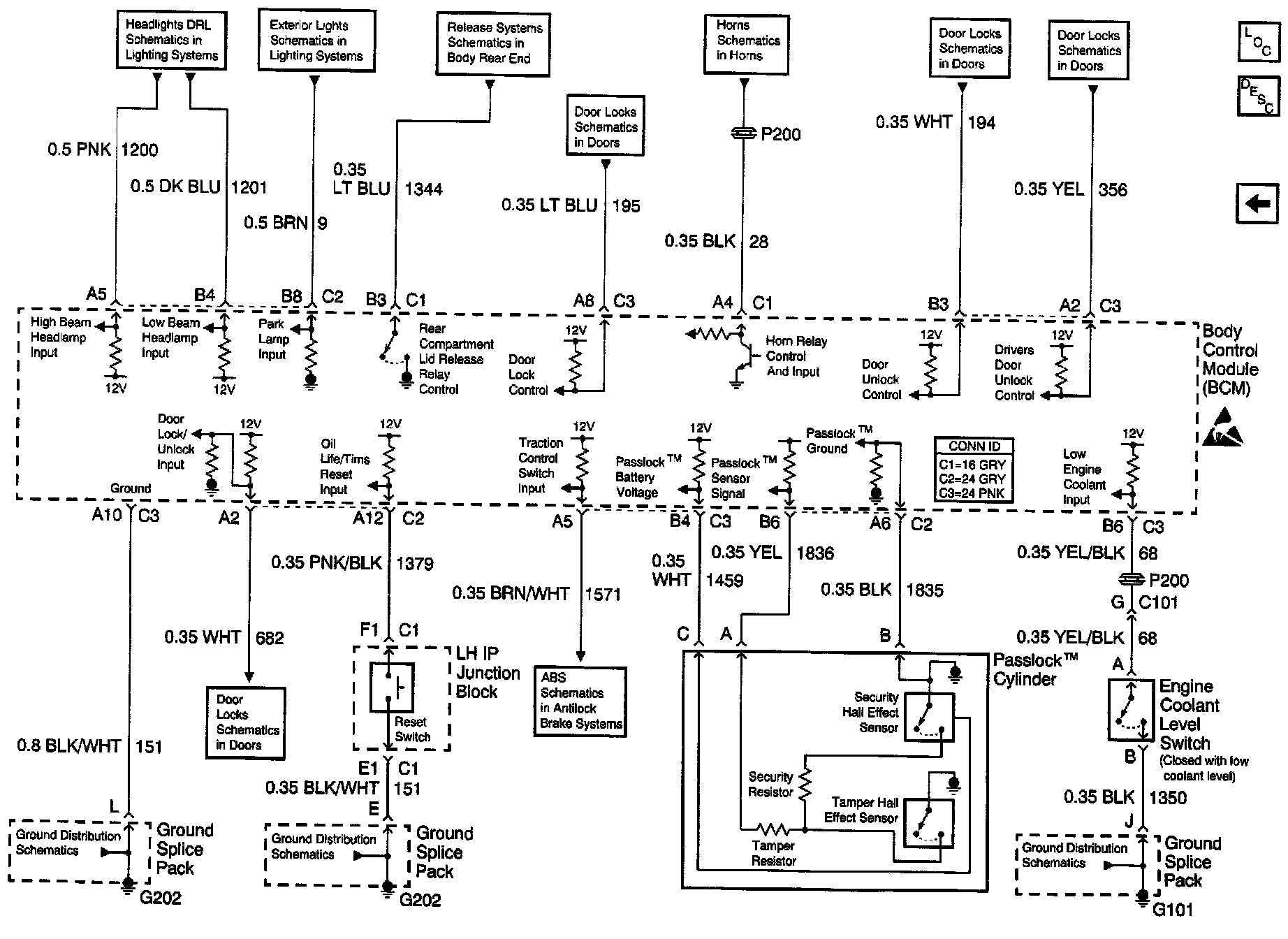 Body Control Module Schematics: Engine Coolant Level Switch, Horn And Rear Compartment Control, Passlock(TM) Cylinder, And Headlamp Inputs: